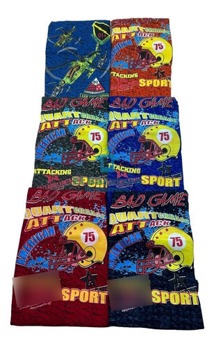 media docena de conjuntos de playera y short, disponible en tallas surtidas: 2 en talla CH, 2 en talla M y 2 en talla G.